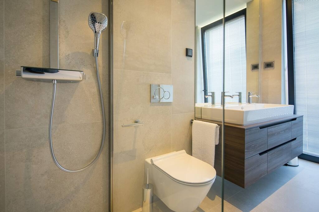 Wide clearance to shower and toilet