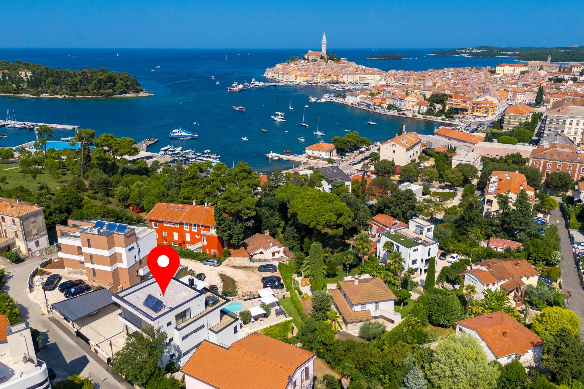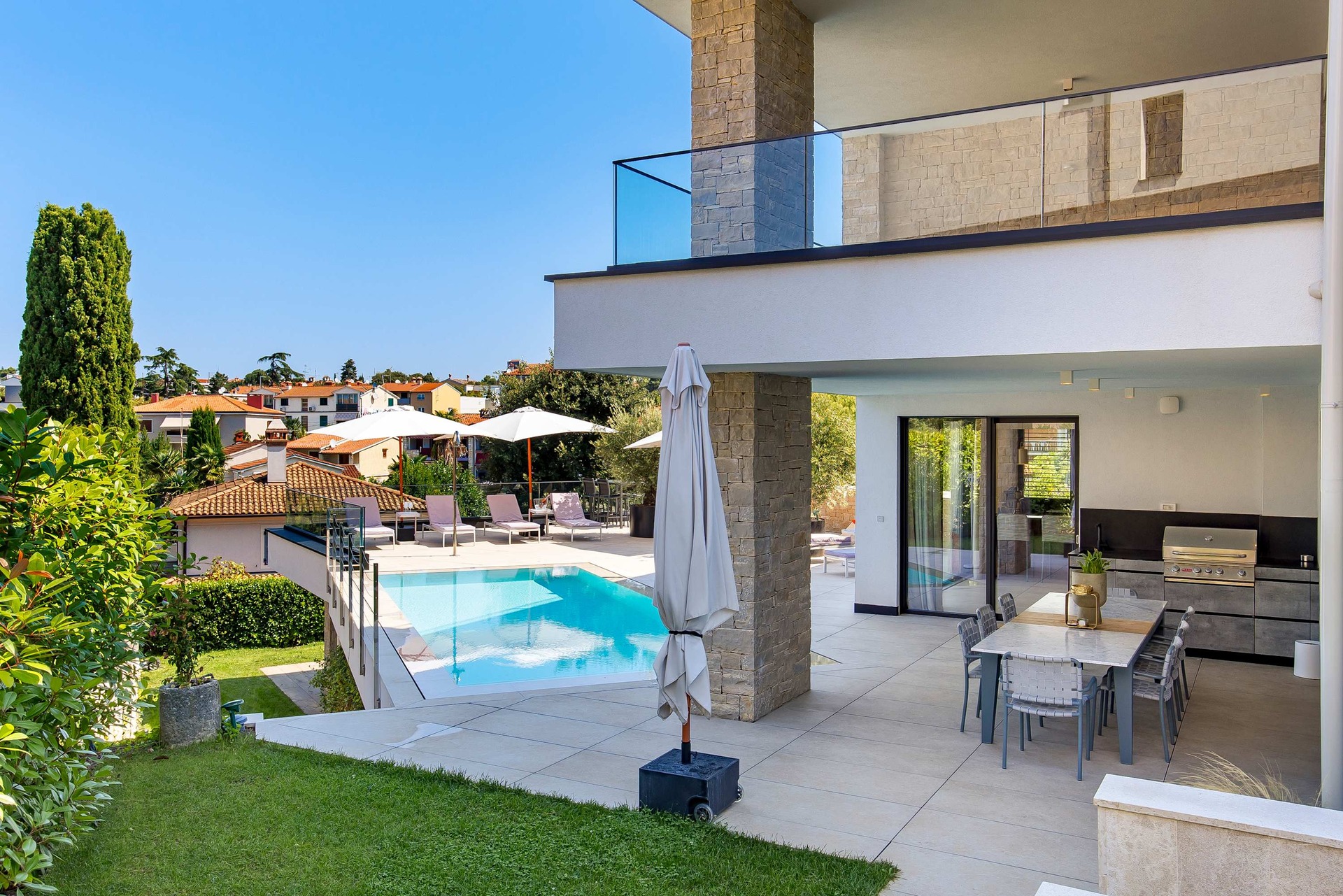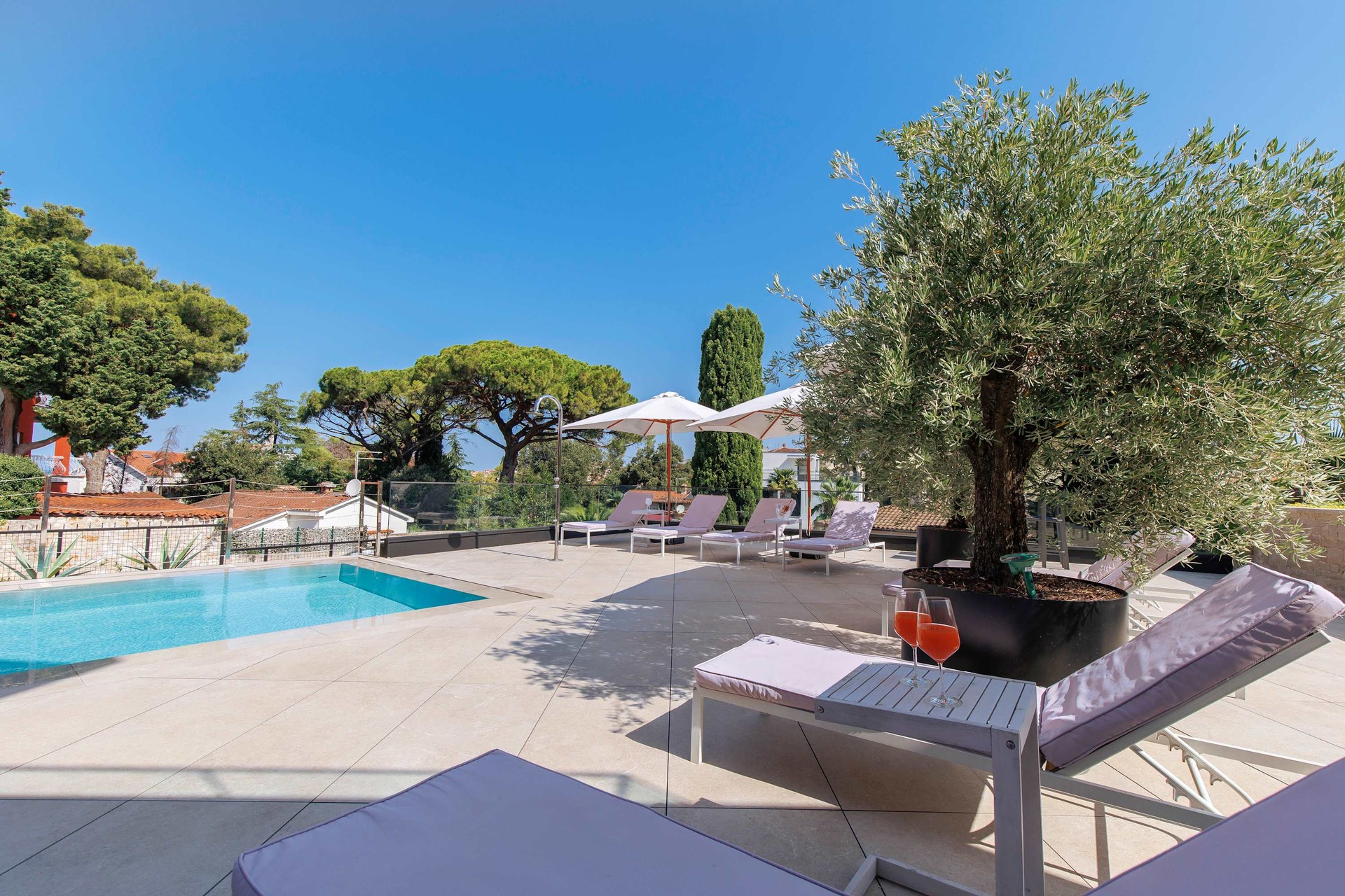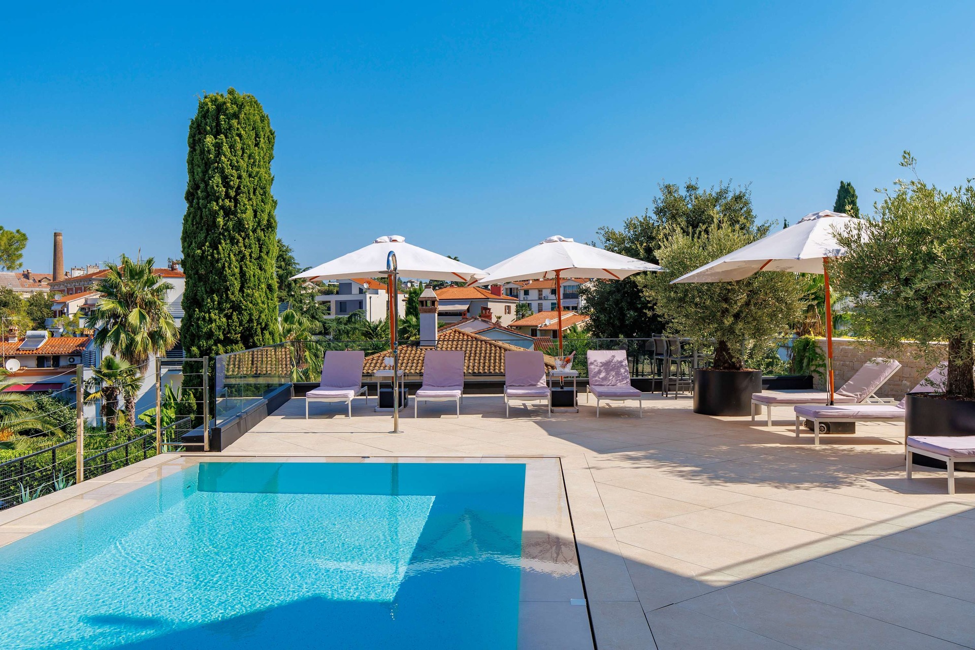 Villa Albion is a luxurious 5-bedroom retreat in Rovinj, designed for guests who value privacy, comfort, and elegance. Ideally located within walking distance of the old town, marina, and popular beaches like Mulini, this exclusive villa offers a peaceful haven close to the Adriatic coast’s finest attractions. Each of the five spacious bedrooms includes a king-size bed, en-suite bathroom, Smart TV, minibar, safe, and access to a private terrace with scenic views. The outdoor area is perfect for relaxing and entertaining, featuring a heated infinity pool, Jacuzzi, Finnish sauna, sun loungers, and umbrellas.