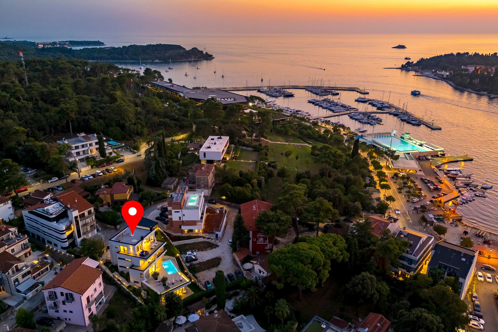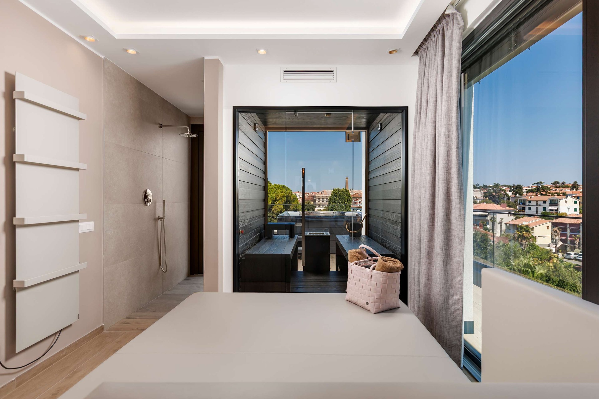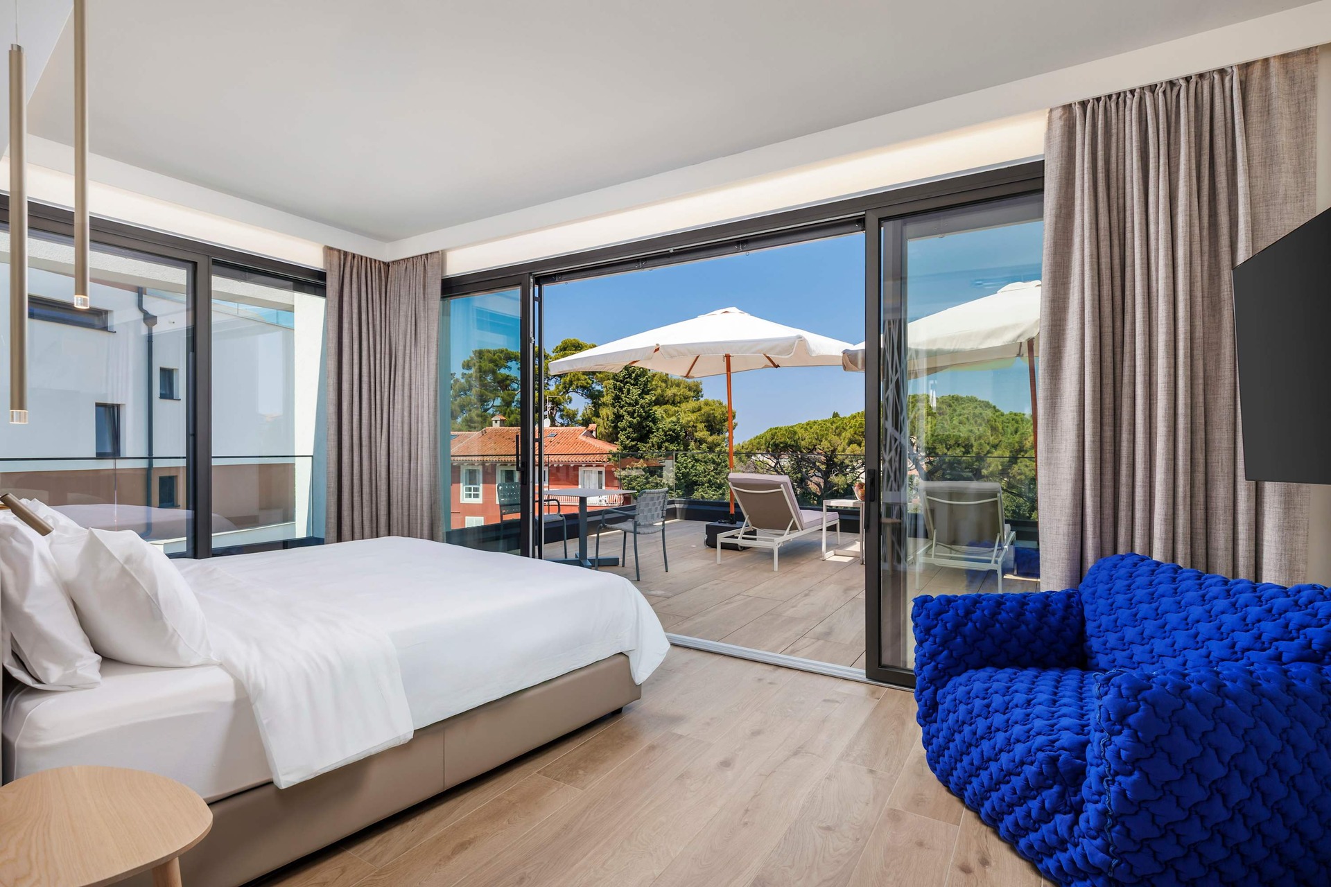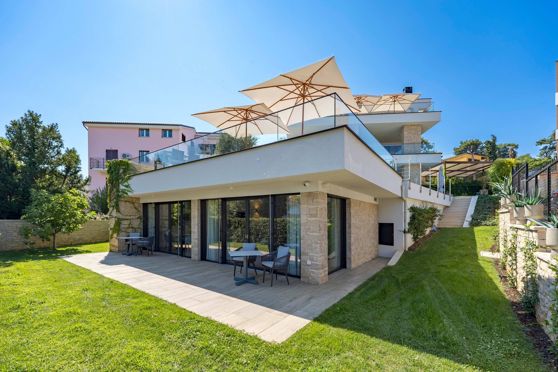 Villa Albion is a luxurious 5-bedroom retreat in Rovinj, designed for guests who value privacy, comfort, and elegance. Ideally located within walking distance of the old town, marina, and popular beaches like Mulini, this exclusive villa offers a peaceful haven close to the Adriatic coast’s finest attractions. Each of the five spacious bedrooms includes a king-size bed, en-suite bathroom, Smart TV, minibar, safe, and access to a private terrace with scenic views. The outdoor area is perfect for relaxing and entertaining, featuring a heated infinity pool, Jacuzzi, Finnish sauna, sun loungers, and umbrellas.